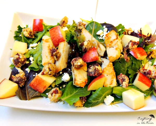 Are you looking to lighten up your menu a little now? I’m sharing a tasty salad recipe that’s great for lunch or dinner. It’s sweet and tangy from the maple and mustard in the dressing. Then the salad is full of healthy greens, protein packed chicken, apples, feta cheese and topped with crunchy Craisins® Fruit Clusters.