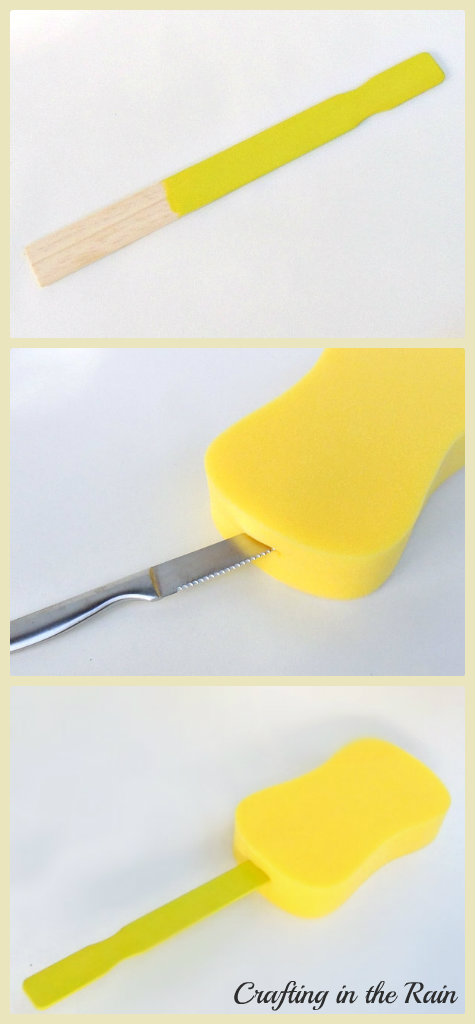Use a serrated knife to cut a slit into the center of the sponge on one end, and cut a depth about to the middle…please don’t cut your hand! Spread some hot glue on the end of the stick and push it into the cut sponge.