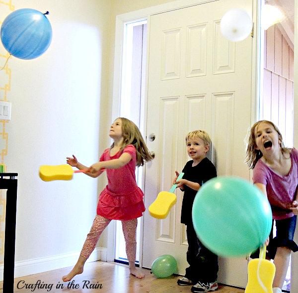 Blow up a few balloons and let the kids go crazy…but not too crazy 🙂 Since the sponges are nice and soft, there is little chance that anyone will get injured. Great cheap fun- hope you’ll try it!