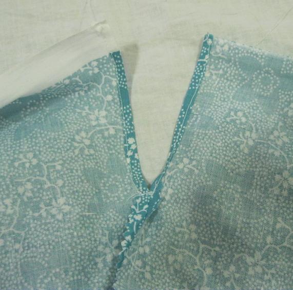 3. Turn the top edges over twice and edgestitch to finish the armhole. Sew back and forth a couple times across the point of the “v” to keep your side seam from ripping