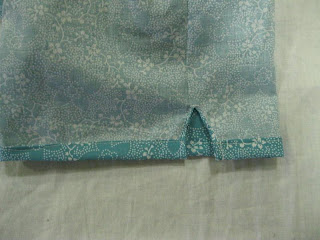 7. If you cut on the fold then make a 2″ish cut up the outer side leg starting at the bottom edge. Turn the edges over twice (just like on our top) and edgestitch. If you didn’t cut on the fold then only sew part way down the side and then finish your edges (again just like the top)