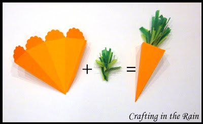 For the carrot top you’ll make a tissue paper fringe. I used two colors of green–you can use whatever you have. I cut two pieces of tissue that were angled. It’s about 6 inches wide and about 2 1/2 inches high on one side and only about 1 1/2 inches high on the other.