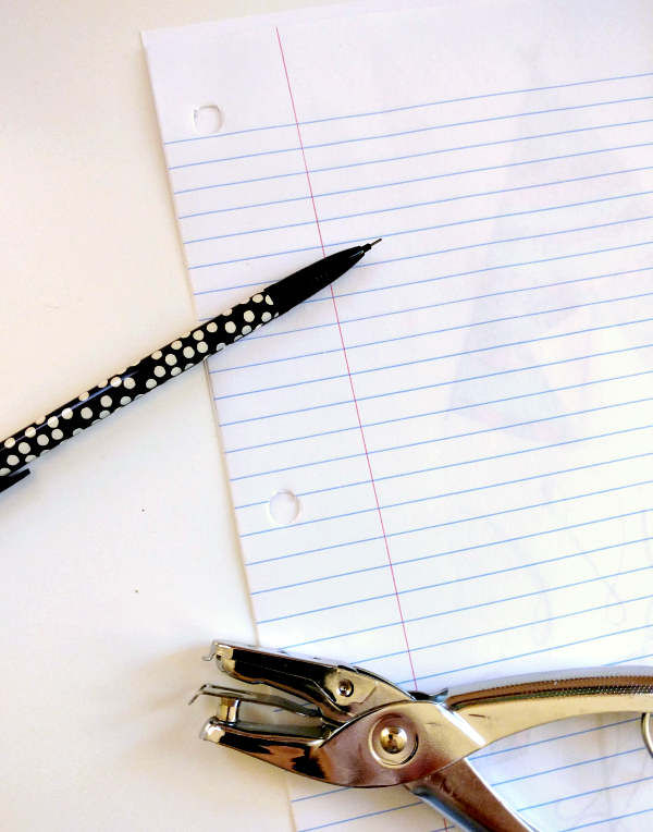 The last step is to add the holes. If you have a 3-hole punch, just punch it and your done. I don’t, so I trace the 3 holes from a regular piece of notebook paper and punch with my single hole puncher.