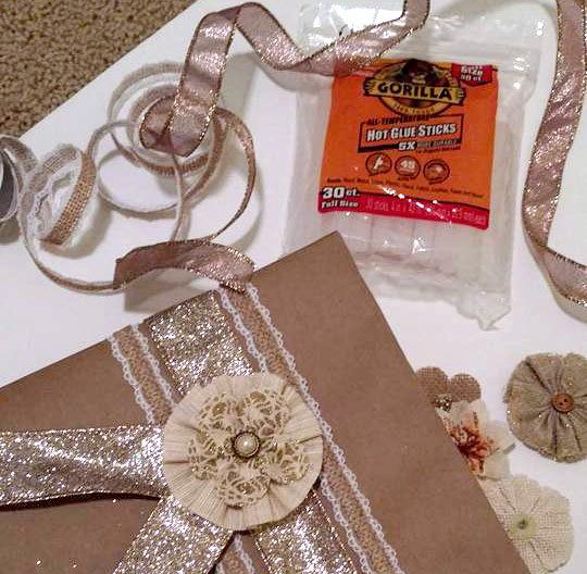 Next gather some pretty ribbon and craft flowers. I purchased a package of these flowers already assembled, but you could easily make your own with burlap, paper and fabric (and Gorilla Hot Glue Sticks of course.)