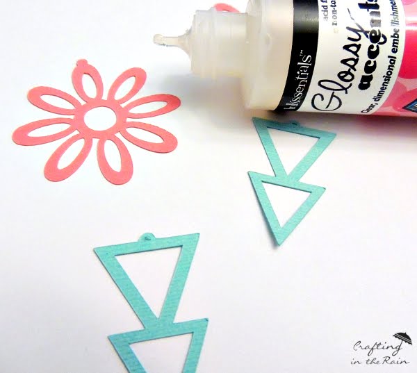 Inside the box are 3 colorful pair of paper earrings, all cut with the Cricut of course! Each cutout gets a layer of Glossy Essentials. When that dries, poke a hole in the top with a needle and put the earring hook in.