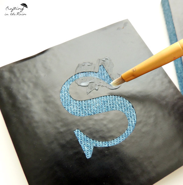 Position the stencil down on the canvas. To try to keep the lines a little cleaner (since the denim has texture it’s a little tricky,) paint the edges with some Mod Podge to try to seal the line. Then paint with red and white paint. It will take two coats to show up well.