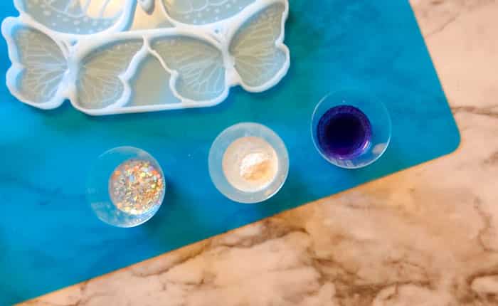 Pour into small cups to add glitter, alcohol ink, or mica powder for coloring. About 3 or 4 drops of ink is good, and about 1/4 tsp of mica powder.