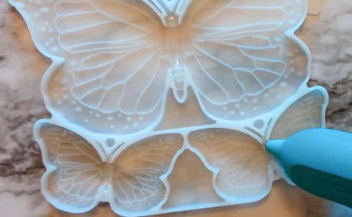 Since I wanted to be able to separate my wings after the resin hardens, I used a glue gun to build up a divider down the center of each butterfly mold.