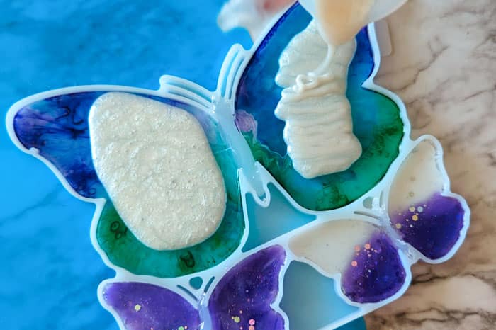 For the large butterfly, after curing overnight, I mixed up 20 more mL of resin, made it white, and poured it as a background for the ink layer.