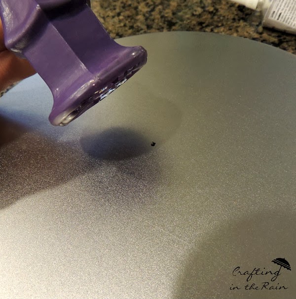 I painted the candlestick with glass paint first before gluing it all together with E6000. Mark the centers with a permanent marker so the candlestick goes right in the middle.