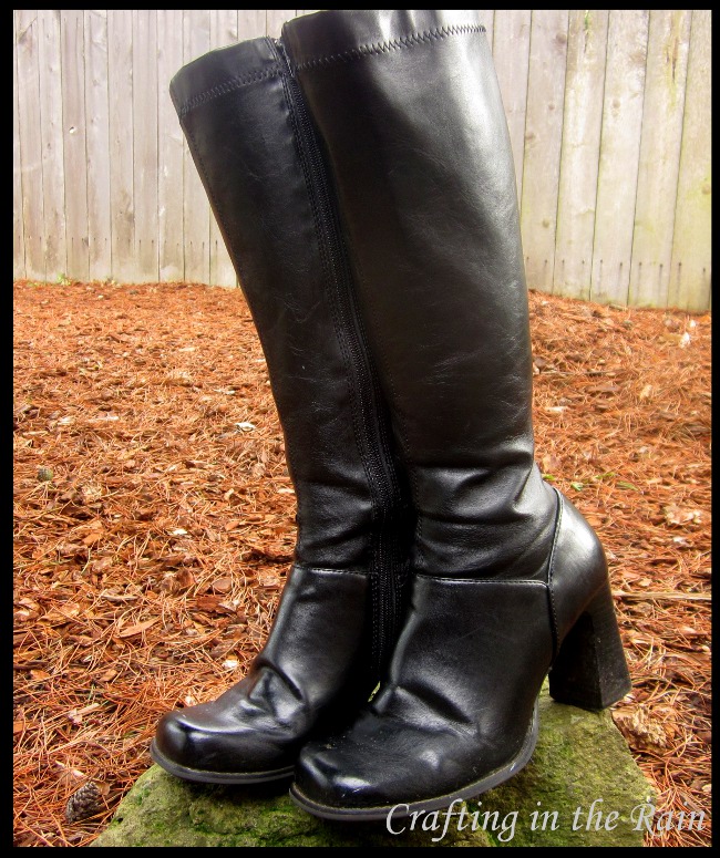 Then I started slapping strips of tape on the boots, making sure to leave about an inch of overhang on top to fold down into the top of the boot. I got about this far and thought–what in the world am I doing?