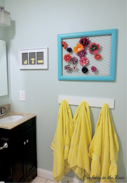 Over the summer we had our hall bathroom remodeled.  It’s the one the kids use, so I wanted to put some kind of cute wall hanging in there, and this is the easy way I did it.