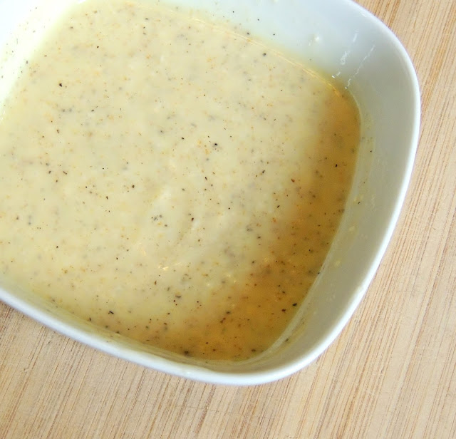 The dinner cooks up all in one pan, in just about 12 minutes. Work on the baguette while that is cooking. To make the toasted garlic baguette, mix 3 TBS soft butter with 1 TBS olive oil, 1/2 tsp garlic powder and 1/8 tsp fresh ground pepper.