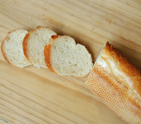 Slice the baguette and toast on a cookie sheet under the broiler for about 30-60 seconds.