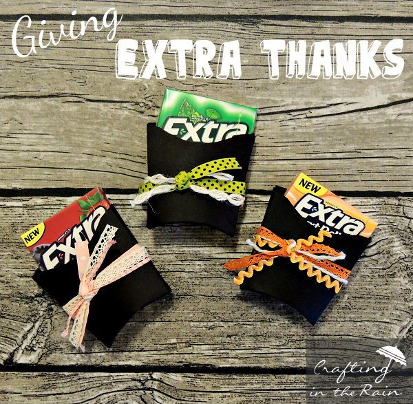 So we decided to find a simple way to give Extra Thanks to some of their friends. I made some plain black fry boxes and we tied them up with pretty string and ribbon. You could skip the box if you want and just tie some string around the package of gum, but we liked how this dressed them up a little more.