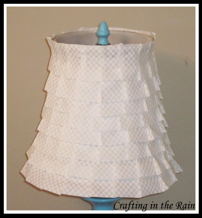 Cut fabric into strips about 2 inches wide (45 inches long because that was the width of the fabric I bought). I just got lucky that it fit around the largest part of my shade. I didn’t do any measuring first, but if you needed a longer strip to wrap around your shade you could sew two together. I was totally wishing for a rotary cutter about now!
