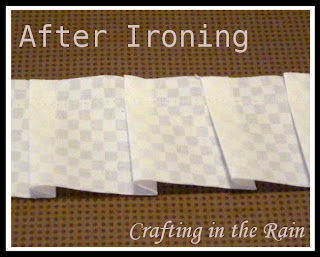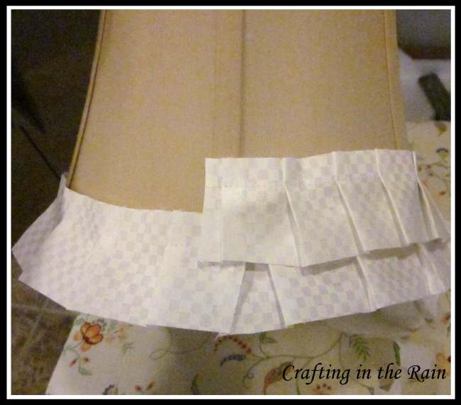 Enter spray paint, a few sunny (or not rainy) hours, and the bases were done. The shades presented more of a problem though. I considered coffee filters, ruffles, fabric rosettes and finally decided on pleats. It went something like this.