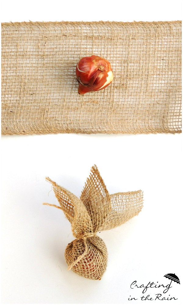 Cut an 8 inch piece of burlap and wrap up one flower bulb inside, tying the top with twine.