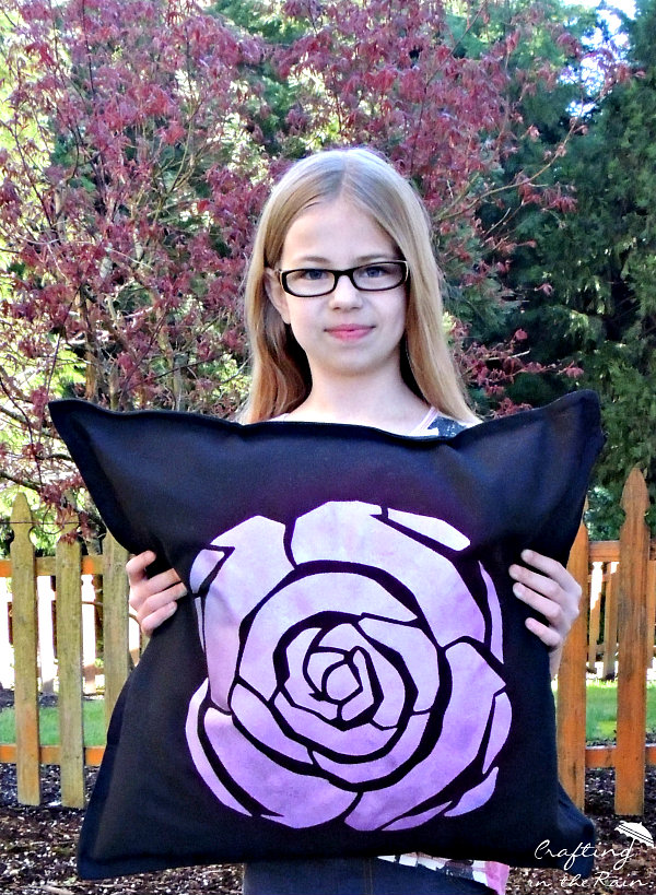 Then the paint the areas inside the stencil. We had to hold it down in a few places so it wouldn’t lift up as we were painting. Like I said, it took about an hour to cover the whole stencil and then it was time to remove the tape and lift it up. When the paint is completely dry, put the actual pillow inside the cover.