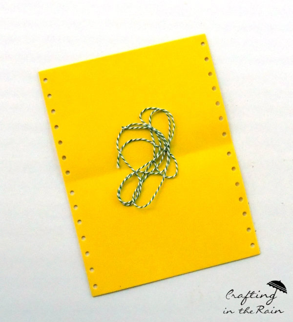 Cut a piece of twine 4 feet long. Fold the foam in half and start with the bottom (near the fold) left hole. Tie the end in a knot through the first hole.