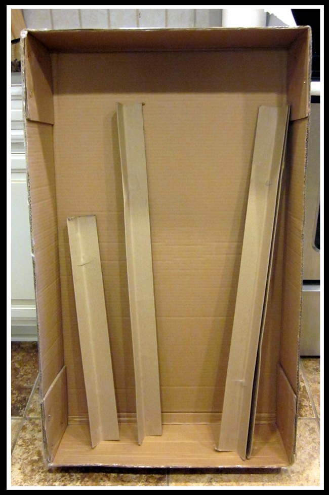 I had collected a couple of paper towel rolls when I remembered we had these in the garage. A big box and corner protectors from the birdcage we recently purchased.