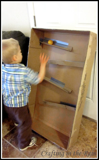 I had to angle the carboard pieces up a little. Since they were just right angles, the ball wouldn’t stay in them as it rolled from one level to the next (like it would if they were the rounded tube shapes)