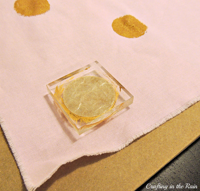 Attach felt pad to clear block and cover with gold paint–I added a couple of drops and spread it around with a brush.  I didn’t even use fabric paint either, since the texture of it doesn’t really matter.