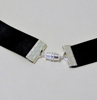 Attach fasteners, if using. I also added just a bit of E6000 to the clamp before pinching the ribbon in it. Or tie ends in a knot so it’s still big enough to fit over your head.