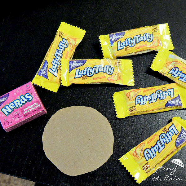 This particular candy mix has the perfect pieces to decorate a wreath. Make a candy flower by gluing Laffy Taffy and a box of Nerds down on a cardboard circle.