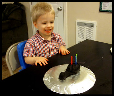 I took a big slice of the Costco chocolate cake we bought for my birthday that was Sunday and stirred it all up so the cake and frosting were mixed together. Then I just scooped spoonfuls out on to a plate and smooshed and molded it into a helicopter shape. I colored the tops of two popsicle sticks with black marker and glued one on top of the other. When it dried I pressed them down gently on the top of the cake. I was pretty sure my shaky hand would ruin the whole thing if I tried to draw windows or anything with frosting, so I just left it like this. It passed–and he loved it!