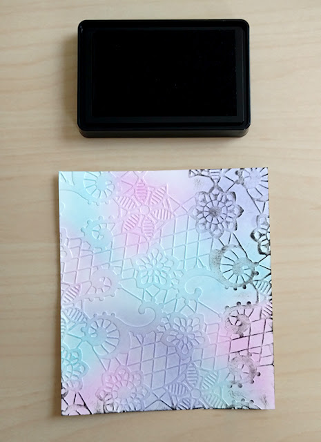 Step 3: Decorate. This is where it really starts to get fun. On the embossed white piece I used cotton balls to rub craft chalk all over the pattern. Then I used a black ink pad and just lightly rubbed it across the surface. It gets this cool rainbow background and the raised pattern pops even more with the black on it.