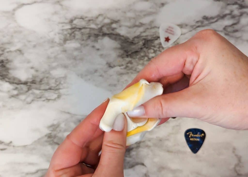 Press the guitar picks into the putty to create the mold space. Take care to not push so hard that it goes all the way to the table and a hole develops in the bottom.
