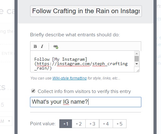 Type in the top box what you want the entry to say in the form. I put “Follow Crafting in the Rain on Instagram.” Then in the box below type “Follow” then click the link icon (it’s just to the right of B and I) Replace “your text to link here….” with the text you want hyperlinked. And then replace “https://your-url-here” with the destination URL.