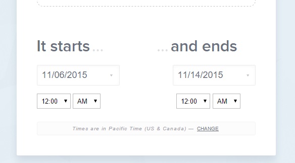 Add an other entries you want and set the start and end time. Unless you want to pay, you can’t change the hour of the start and end time. So just make your giveaway end at midnight on the end date by picking “12 AM” of the next day. (For example, this giveaway will run through midnight on November 13th)