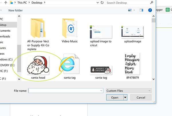I purchased some Christmas images, and one of them was a cute Santa head. I wanted to attach it to a tag. Here’s the step by step how to upload your own images in Cricut Design Space.
