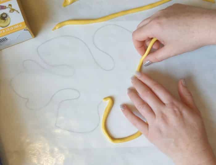 Roll it into a snake that’s a little thicker than a pencil. Bend it around on the paper to follow the leaf shape. Pinch ends together where they meet, trying to smooth a bit. Press it all down a bit too, to make sure it has flat contact with the freezer paper – but don’t lose the height.
