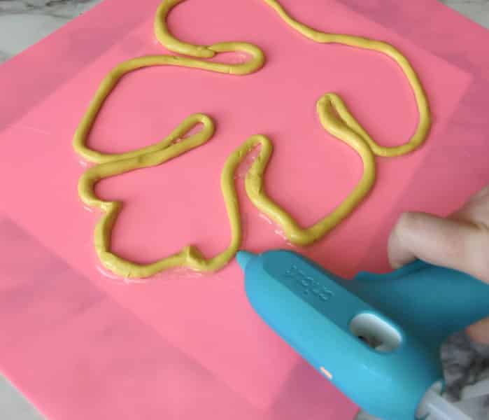 Let the mold putty set for at least one hour. Then put the leaf pattern under the silicone mat and move the putty rope over to the silicone.