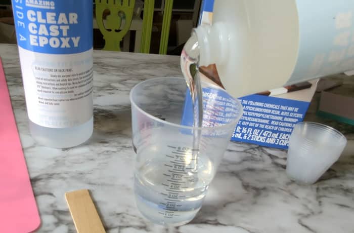 In a measuring cup, pour 2.5 ounces of part A and 2.5 ounces of part B of Amazing Clear Cast Epoxy. Stir for 4 minutes or until no swirls are visible.