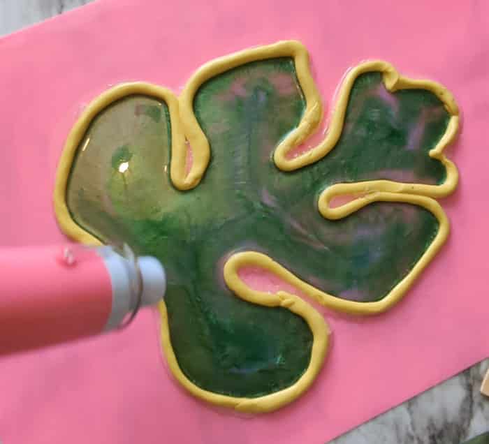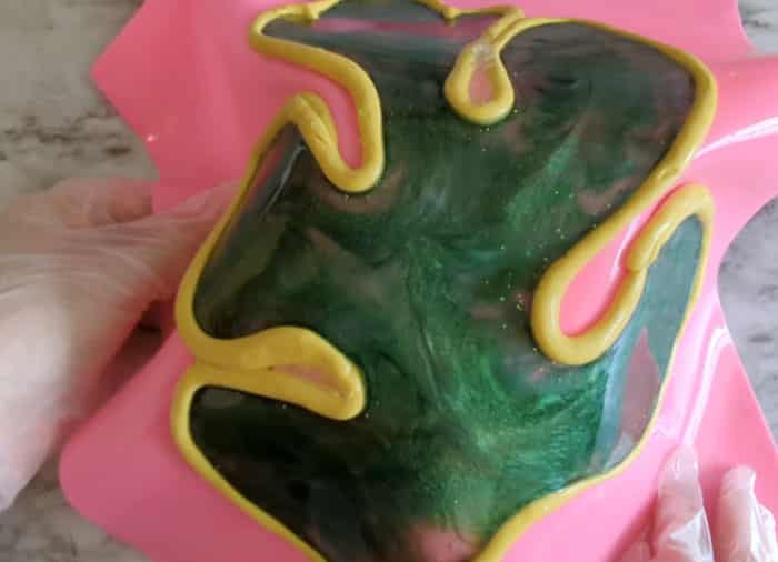Then pour the colored resin into the mold, kind of following the shape of the leaf as you pour it in. When the mold is filled in, about 1/4 inch deep or a little less, remove bubbles with a heat gun.
