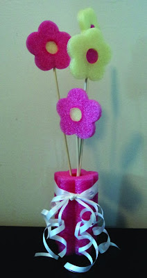 I sliced a pool noodle with a serrated knife to make the flower stamp, then used scissors to trim a piece into a circle.  Then my girls stamped white pillowcases in the pattern they wanted.