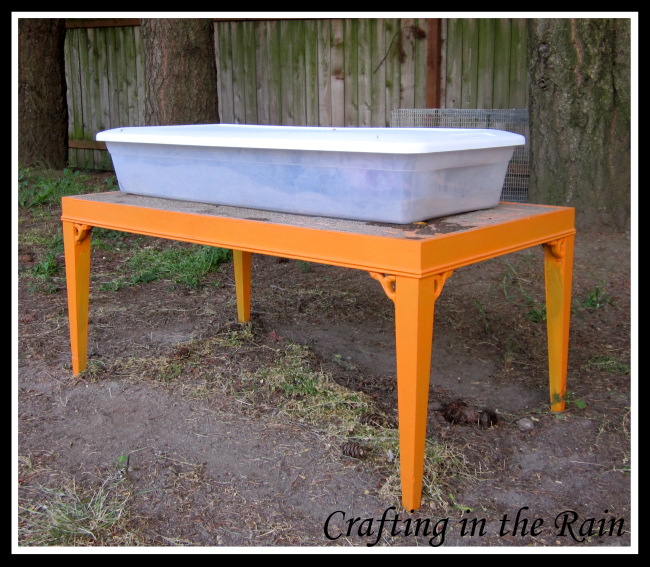 I picked up the coffee table at a garage sale for $5 and primed and painted it. I bought a color sample of Citrus Blast from Home Depot and used about half of it in painting 3 coats on the table. I do realize that it will live outside and I have no idea how the paint will hold up to the elements, but I’m not too worried about it either.