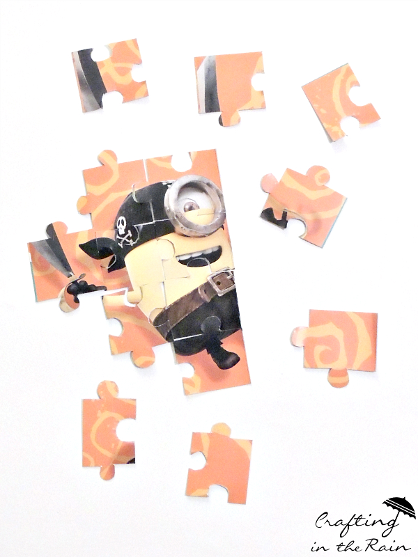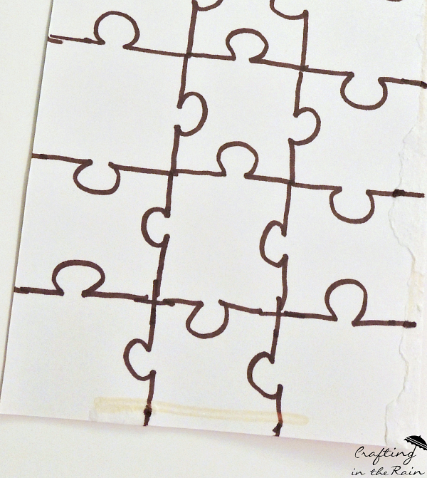 First we cut the front off of their cards, then peeled the two layers carefully apart so there was a blank side. I flipped them over drew a puzzle pattern on the blank side.