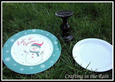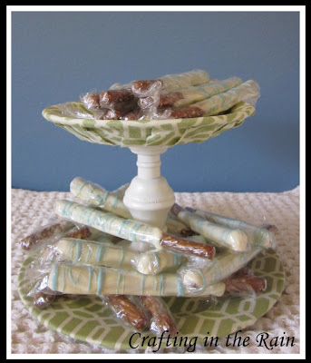 I helped with a baby shower over the weekend, and needed something to put the dipped pretzels on. I saw this creation a few weeks ago and decided to make my own. I already had the candle stick that I wasn’t using anymore, and at a church rummage swap I picked up the plates for free.