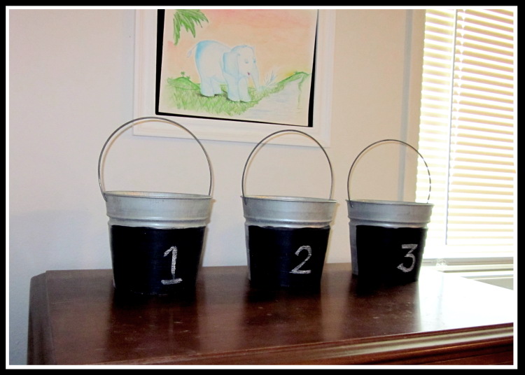 The second was chalkboard painted buckets and Where Women Create magazine from HodgePodge (via Hawkerswife) Ultimately, I’d like to put these in my laundry space out in the garage (when it recovers from the mess we’ve thrown there in the name of remodeling) but until then, they’re hanging out in the girls’ room.