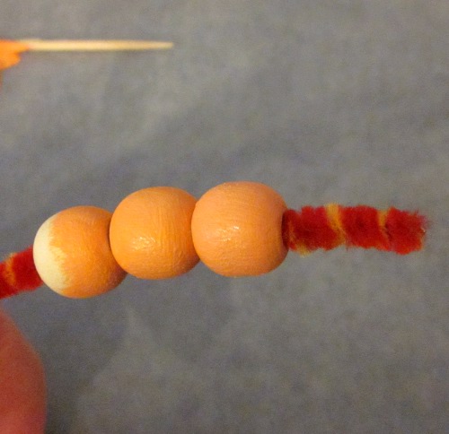 Thread beads onto pipe cleaner. This makes them easier to hold and paint, though it’s still not completely mess-free. Starting with the darkest color, paint your predetermined number of rows.