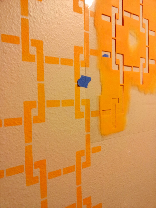 Here’s something I did that might be useful to some of you too. To double check that the color you chose is one you’ll like for the whole wall, paint a part of the pattern onto a square of plastic wrap. When it dries, hang it up on the wall and see what you think!