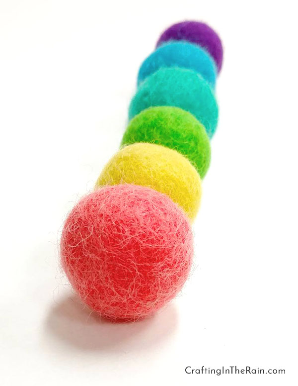 When all the paint was dry I used wood glue and clamps to attach the frame pieces and let it dry overnight. I was sent a sample pack of felt balls from The Felt Pod and picked out 7 perfect rainbow colors to add to the top of the sign. I used a needle and white threads to sew right through the center of each ball. Then I glued the string ends around the back of the sign.