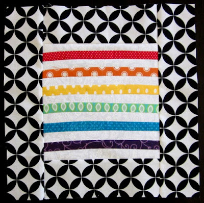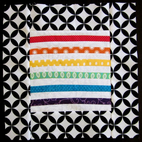 In case you’re curious, I cut one inch strips of each color and the white and sewed them each together. Then I cut that into an even square (came out to 7 1/4 inches) Then I cut black and white pieces (what I used for the backing of Emily’s quilt) about 2 3/4 inches wide to make the whole square 12×12.