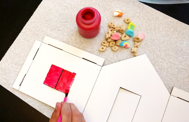 The cardboard kit was provided to us, but you could do something similar with shoeboxes or other cardboard you have around your house. We painted the walls and windows and used washi tape to decorate the roof. Lucky Charms were a perfect crafting snack.