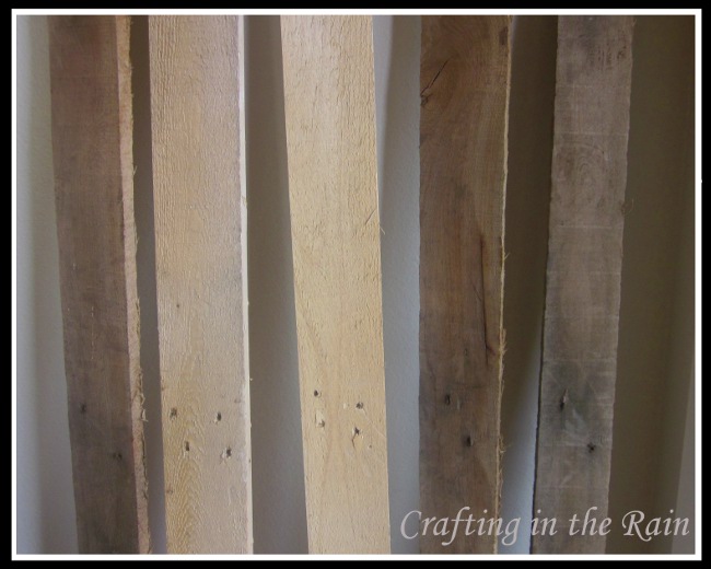 I didn’t completely disassemble the pallet either, I just took the pieces I wanted (the skinnier ones) off of 2 pallets. The older wood pulled apart easier than the new wood. But hammering the nails out of the slats was easier in the new than the old wood. Once the nails are out, sand all the pieces. We’re going for “rustic” here, not “deadly.”